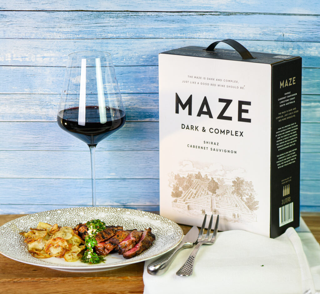 Här låter vi biffen tala sitt tydliga språk, med chimichurrins örtiga hetta som brygga till det australiensiska Maze där shiraz och cabernet skiner i kombinationen. Ett möte som förenas i perfekt balans.