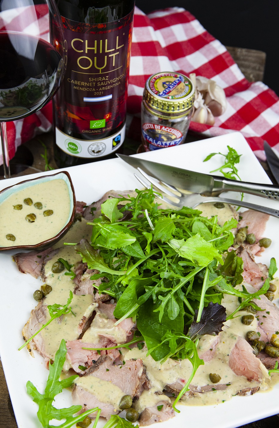 Måste man dricka viner från samma region som en maträtt härstammar från. Absolut inte utan vad allt handlar om är att möta rättens attribut med vinets och i det här fallet blir det helt rätt då vi fångar tonfisksåsens sälta med en kontrasterande skön mognad i vinets frukt som även tar hand om kaprisen. Att druvorna vuxit på hög höjd ger en fräschör till vinet vilket maträtten växer med. Servera vinet kylt, vid ca 14 C, för det optimala mötet mellan rätt och dryck.