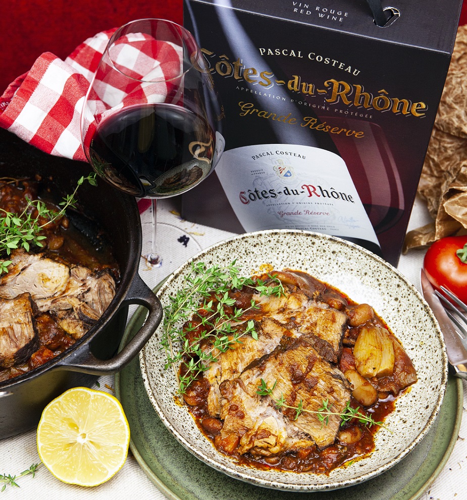 Ibland är det bara så enkelt att sätta mat och vin. Den smakrika karrén och dess långkokta tillbehör matchar vinet fenomenalt bra tack vare det syrligt fina inslaget i rätten, örtigheten och inte minst den mustiga karaktären behöver ett vin som kan ta kampen. Pascal Costeau Côtes-du-Rhône Grande Réserve gör det med bravur.