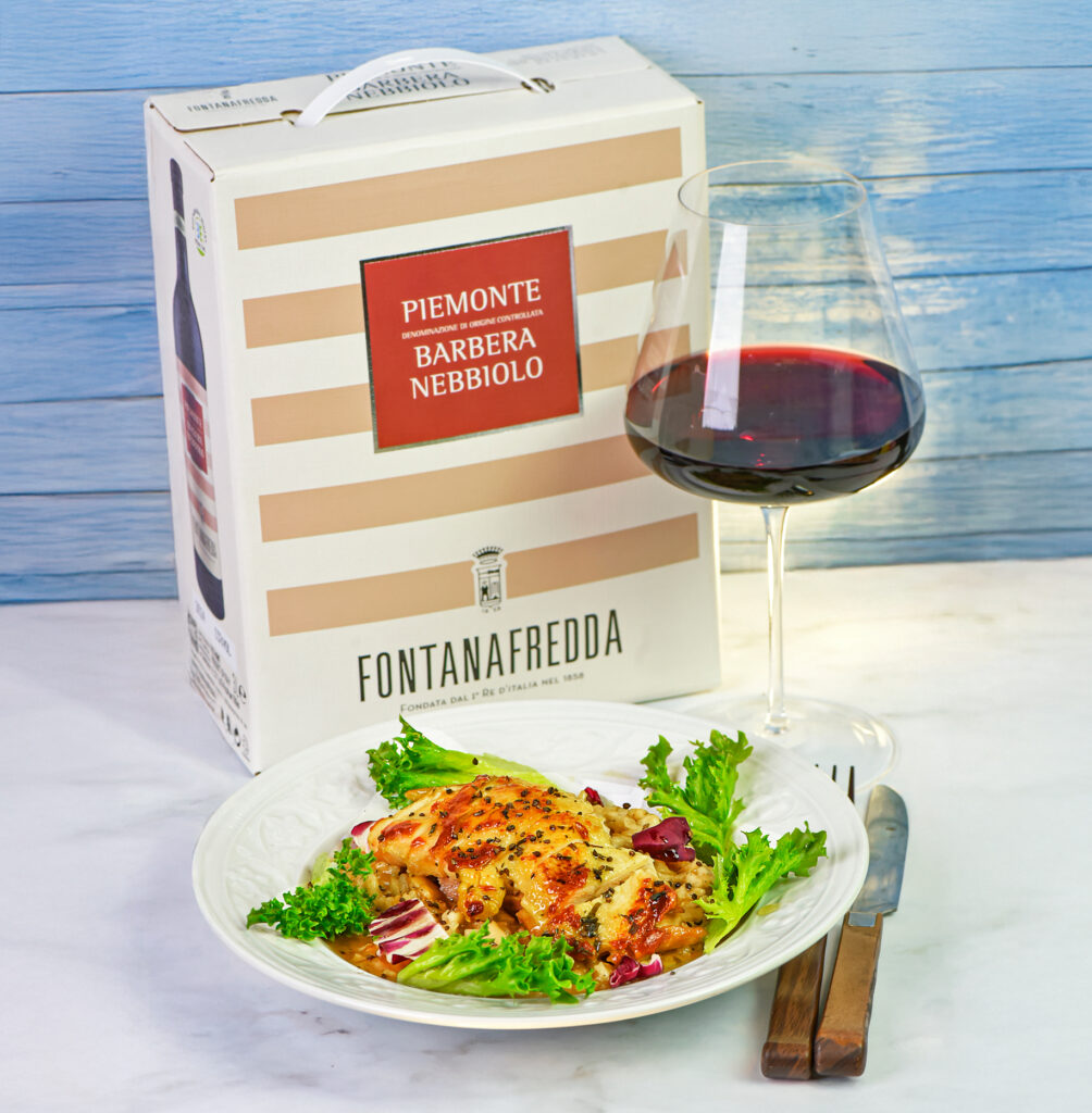 På tallriken idag möts krispigt stekt kyckling med salvia och en silkeslen risotto – en rätt som förenar italiensk enkelhet med elegant textur. Risotto är en av det norditalienska kökets mest älskade rätter, byggd på tålamod och precision, där varje slev buljong långsamt förvandlar riskornen till en krämig helhet. Här får den sällskap av fräscha gröna blad och strimlad rosésallad som adderar friskhet och färg. I glaset: 2024 Fontanafredda Piemonte Barbera Nebbiolo, ett vin som visar hur Piemonte kan förena rikedom och stramhet i ett och samma uttryck – generöst, harmoniskt och med tydlig känsla av ursprung.