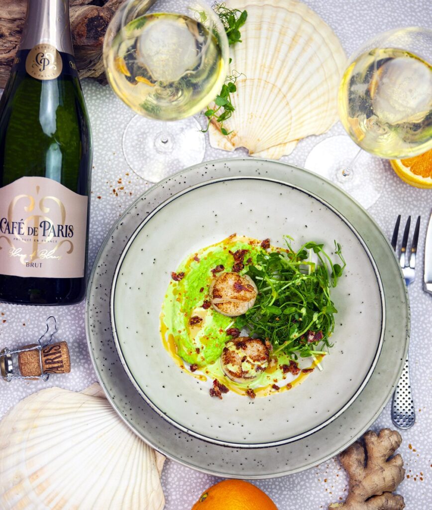 Café de Paris är Frankrikes favoritbubbel och nu har det även nått till oss. Det är ett mousserande vin som visar upp en direkt publik charm men inte utan att släppa på personligheten. Här kombinerar vi vinet till en halstrad pilgrimsmussla som serveras på en ärtkräm, ärtskott, apelsinreduktion, bacon och mortlade apelsinskal. Ljuvligt!