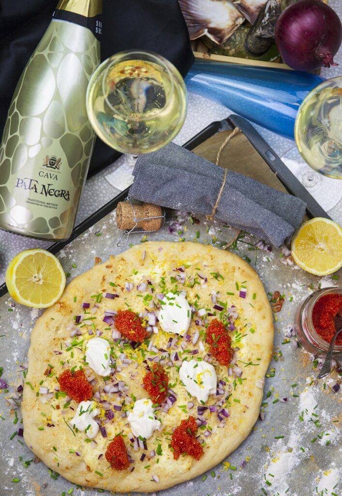 Pizza bianca är en favorit hos oss då den är så vinvänlig, inte minst när vi har bubbel i glasen. Pizzabotten gör du som vanligt men sedan brer du på crème fraîche i stället för tomat och det ger en ljuvlig syrlighet som kontrasterar sältan i toppingen och Västerbottenosten. Till den välsmakande aptitretaren serverar vi synnerligen prisvärda cavanyheten Pata Negra Semi Seco som passar förträffligt till pizzan!