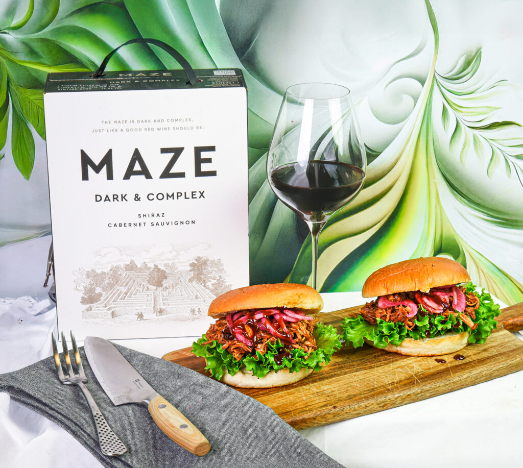 När Maze lanserades på Systembolaget för tre år sedan så blev det en omedelbar succé, vilken hållit i sig sedan dess. Det är en australiensisk box på de klassiska druvsorterna shiraz och cabernet sauvignon där inte minst den förstnämnda är något av landets nationaldruva. Det är ett fylligt och ekfatskryddigt vin från Limestone Coast i South Australia som matchar alldeles fenomenalt i vår servering här med pulled pork burgare