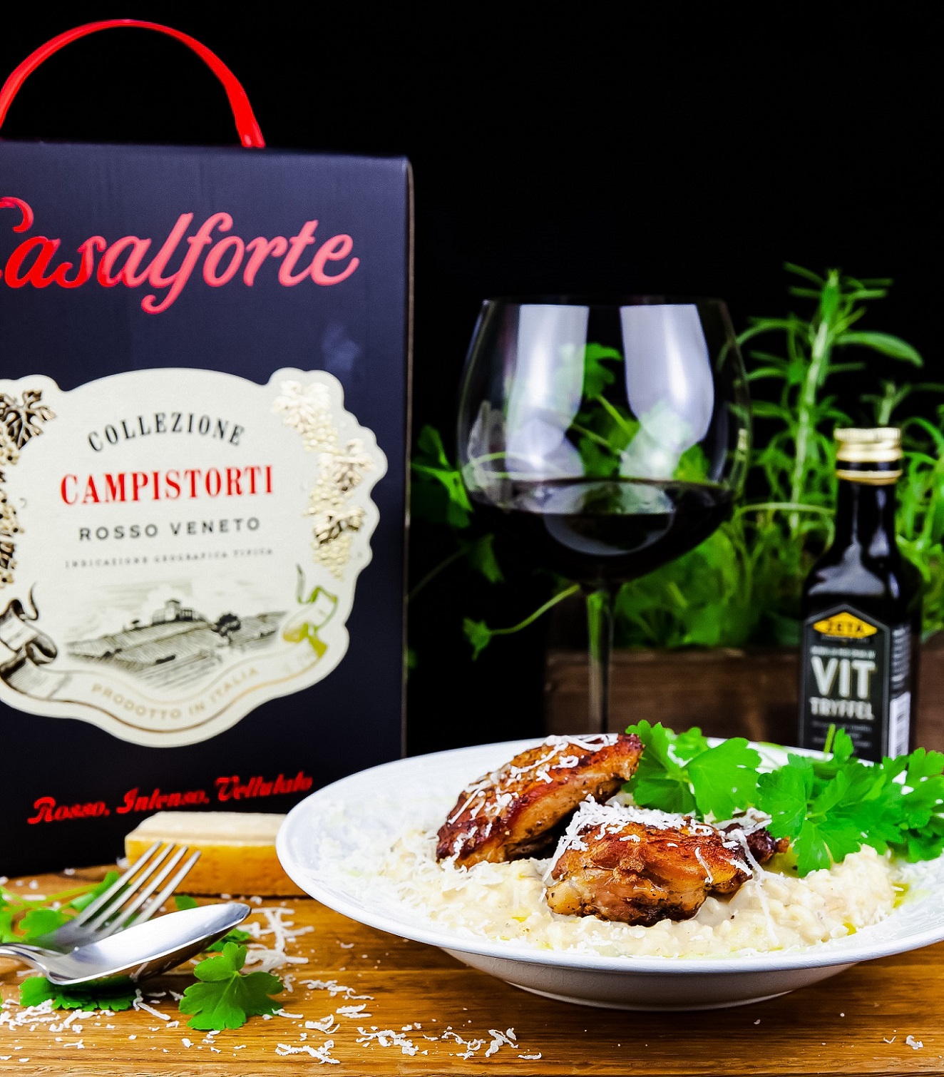 Risottons krämighet, sälta och fina syra fångar omgående vinets uppmärksamhet och Casalfortes lilla rondör blir till en kontrasterande balansakt tillsammans med rätten. Och den knaperstekta kycklingen från Bjäre, ja den bara fulländar mötet!