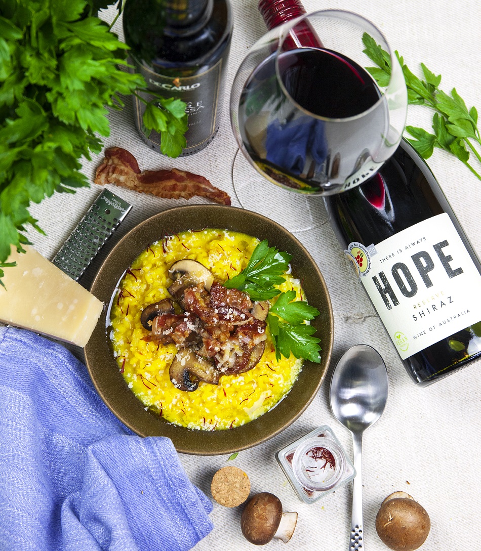 Som sammet i gommen där vinets generösa bärfruktighet trivs förträffligt med saffranssmaken. accelererar i mötet med saffranssmakerna. Tanninerna slipas ner i mötet mellan mat och vin och det kryddiga elementet i shirazdruvan gifter sig perfekt med svamp och inte minst pancettan. En fantastisk kombination.