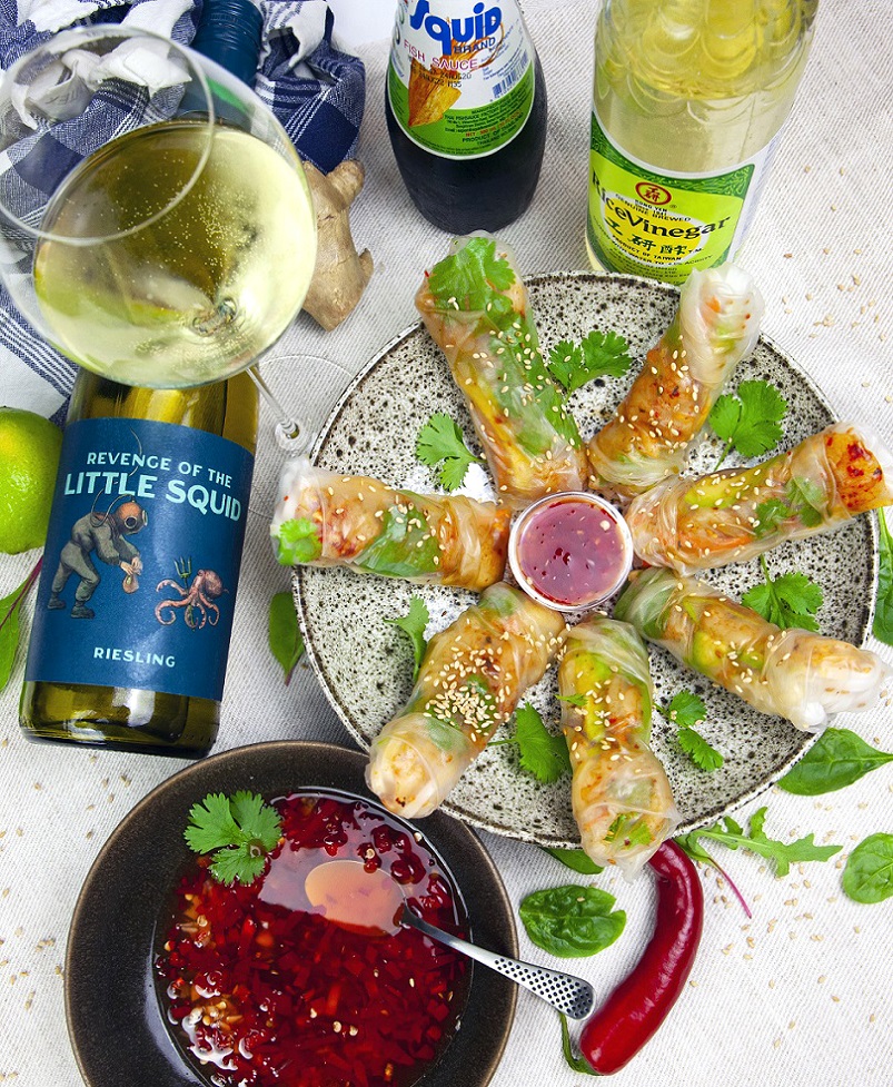 Vietnamesiska springrolls är kul att tillaga, kul att äta och dessutom superbt fräscht med hettan i den kompletterande dippsåsen Nuoc Cham. Just styrkan i maträtten gör riesling med lätt rondör till det mest givna vinvalet och Revenge of the Little Squid kompletterar serveringen på ett förnämligt vis genom att dämpa hettan och accentuera fräschören.