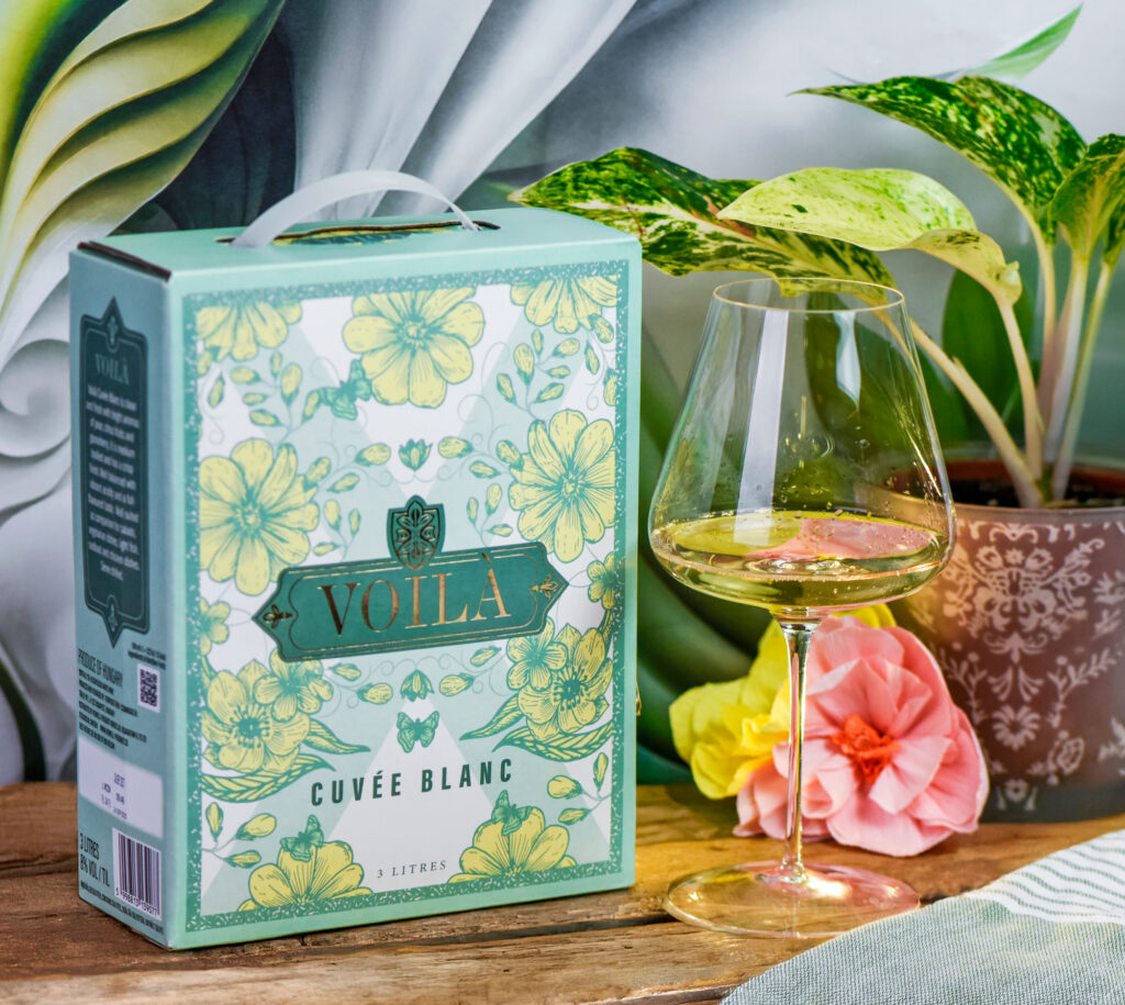 Voilà Cuvée Blanc finner man på Systembolagets beställningssortiment med artikelnummer 79906 (3000 ml, 8%) till det blygsamma priset om 169 kr.