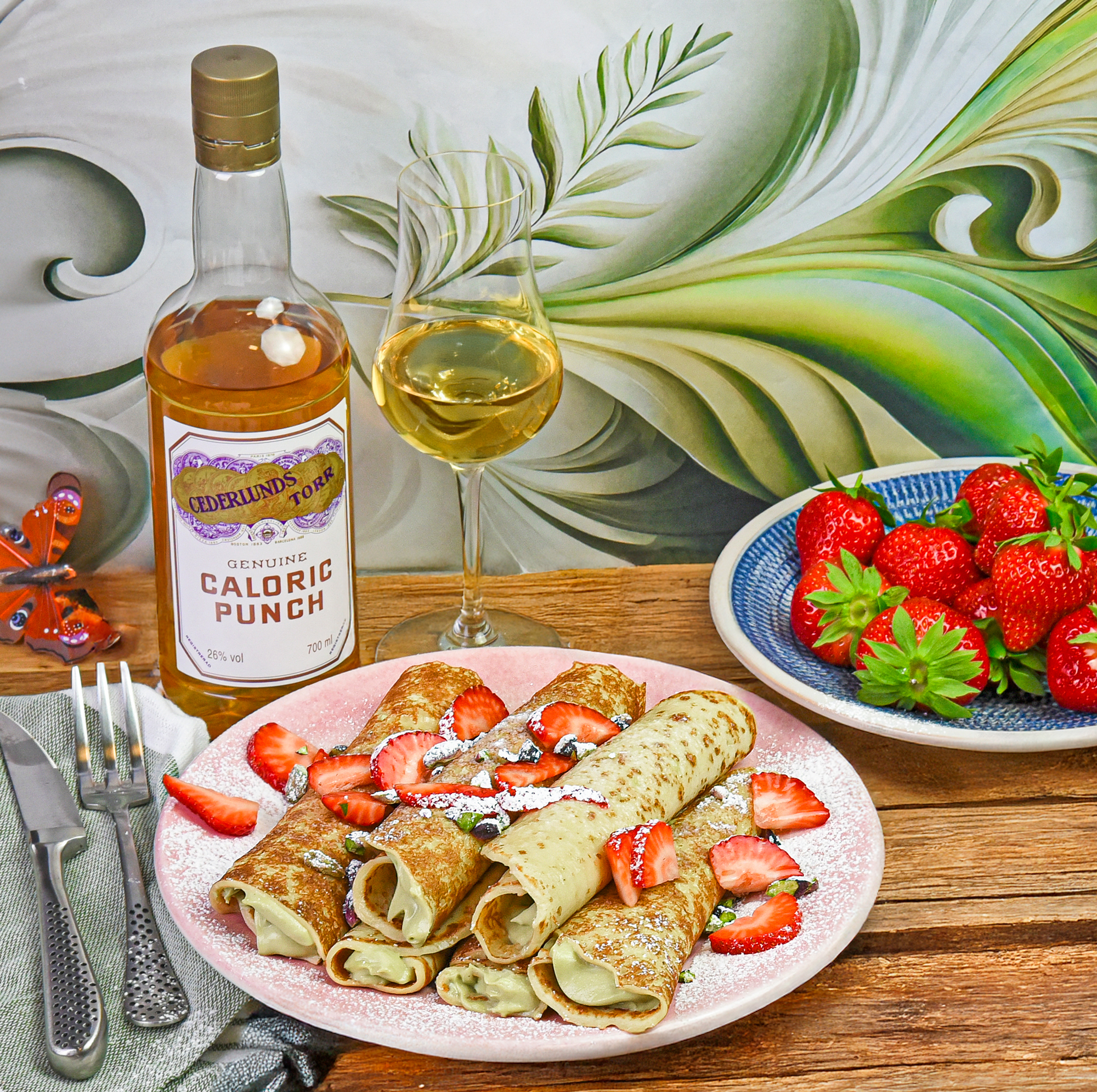 ”Cannolicrêpes” med pistagemascarpone och jordgubbar