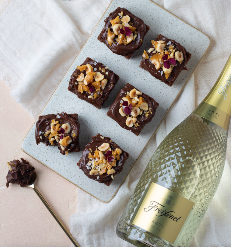 Freixenet Asti DOCG är ett friskt mousserande vin från norra Italien. I samarbete med Henkell Freixenet Sverige har Emma Brink Rask tagit fram chokladbrownies där mjölkchokladtryffel, kanderade hasselnötter och havssalt möter det friska och söta i bubblet.